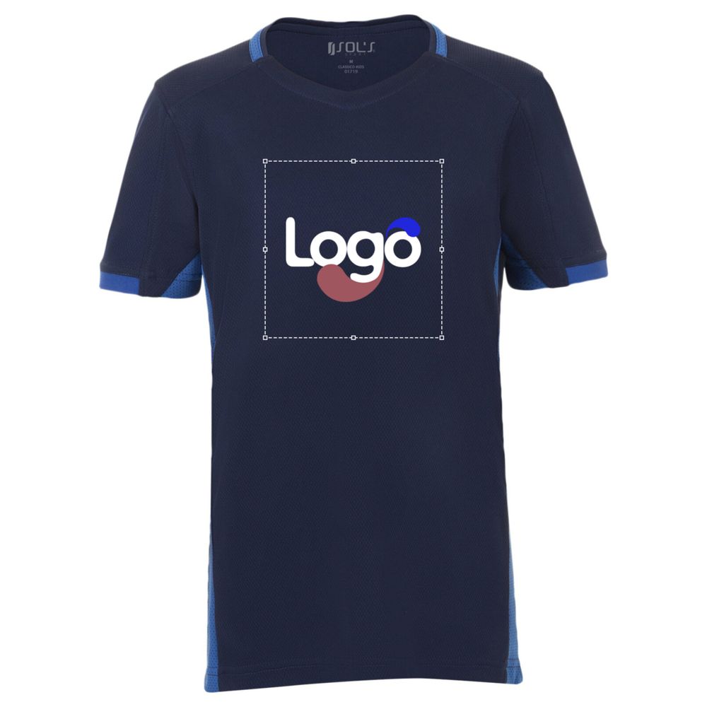 Barn-T-shirt Classico kids är utformat i polyester för optimal komfort. Det har en V-hals med kontrasterande kant och kontrasterande mesh-insatser på sidorna, vilket ger ett modernt och dynamiskt utseende. Denna modell är idealisk för aktiva barn och sportevenemang. Det är möjligt att personliggöra detta T-shirt med ditt logotyp eller ditt visuella material, vilket gör det till ett utmärkt stöd för marknadsföring av ditt varumärke eller för särskilda tillfällen.