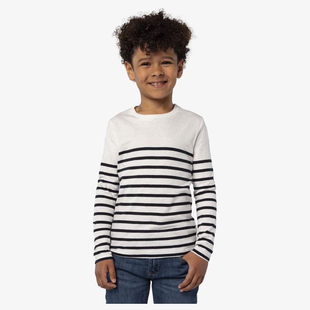 Barn-T-shirt med långa ärmar och randigt mönster. Rät skärning, rund halsring, randigt mönster placerat. 100% kamgatad ringspun bomull. Berikad med enzymbehandling för en mjukare beröring. Denna T-shirt erbjuder optimal komfort för dagliga aktiviteter. Den är konstruerad för att tåla slitage och behålla sitt ursprungliga utseende.