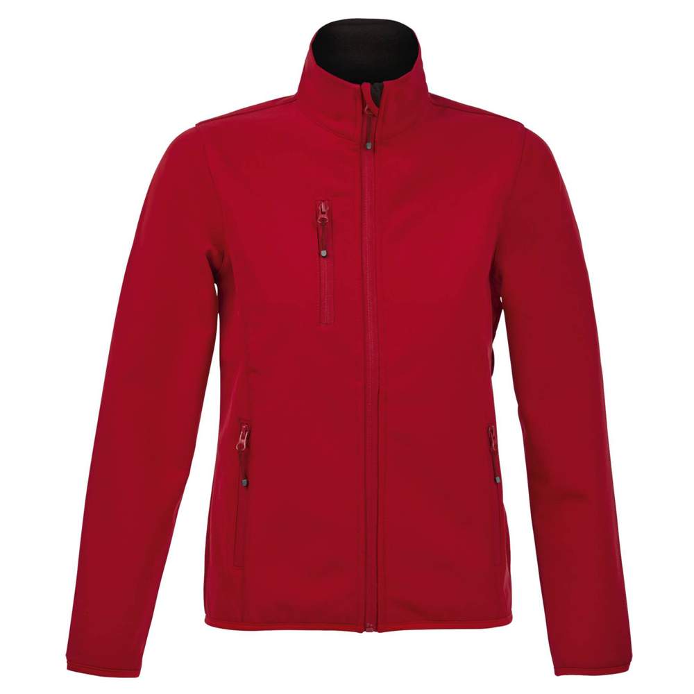 Kvinnors jacka med dragkedja softshell. Öppning med dragkedja fram. Den har två sidfickor och en bröstficka, alla med dragkedja. Ärmarna och nederdelen av plagget har elastiska sneda kantlinjer i ton i ton. Detta plagg är uppbyggt i tre lager för ökad komfort. Inuti är det en polare 100% polyester.