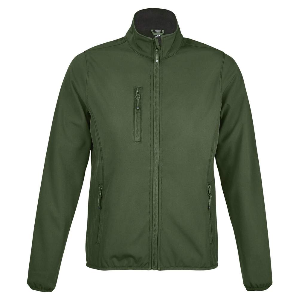Kvinnors jacka med dragkedja softshell. Öppning med dragkedja fram. Den har två sidfickor och en bröstficka, alla med dragkedja. Ärmarna och nederdelen av plagget har elastiska sneda kantlinjer i ton i ton. Detta plagg är uppbyggt i tre lager för ökad komfort. Inuti är det en polare 100% polyester.