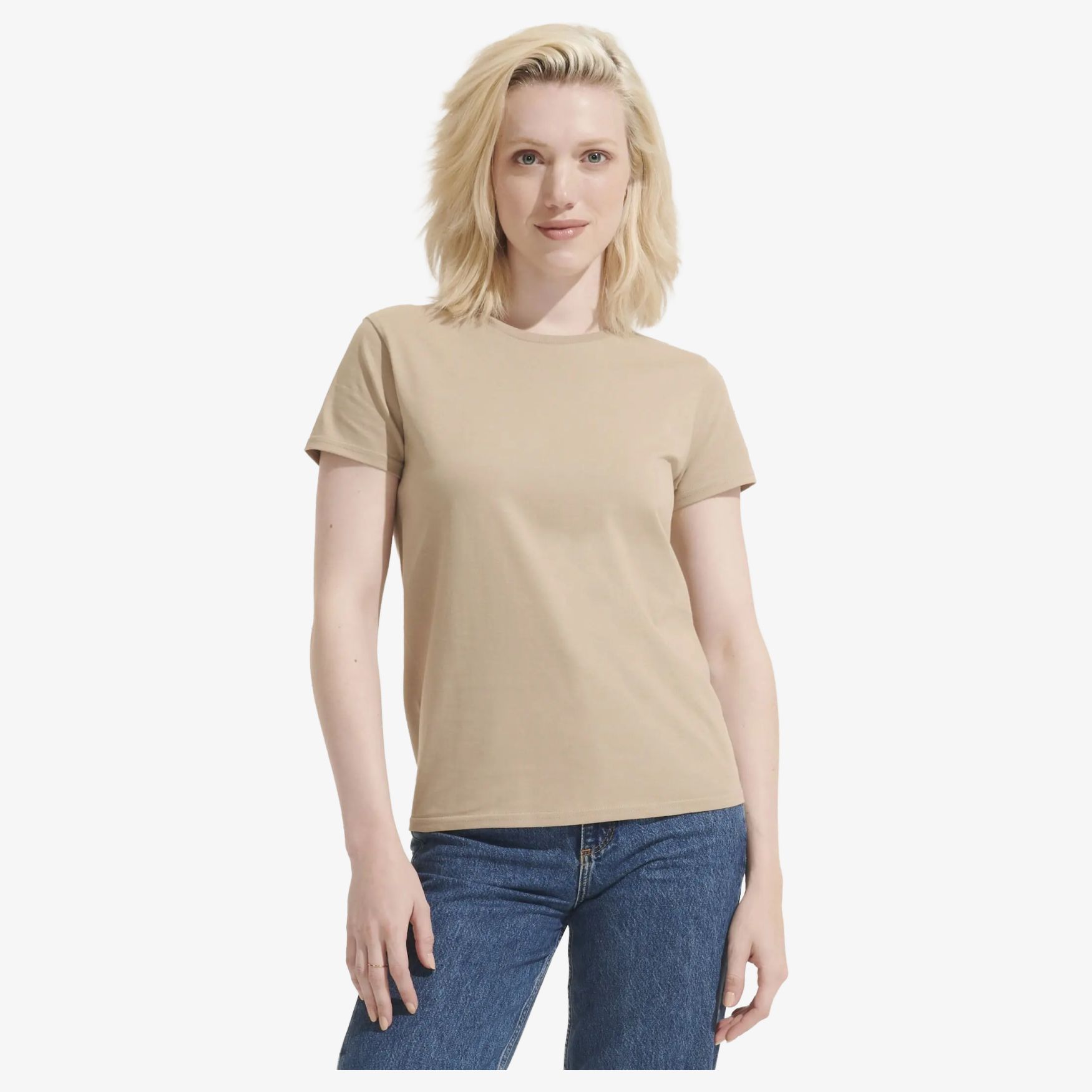 T-shirt för kvinnor i tröja med rund hals justerad passform. Hals med ribbad kanter 100% bomull. Justerad och rörlig passform. Sammansättning: 100% ekologisk bomull ; naturlig behandling för mjukare och slätare kvalitet.