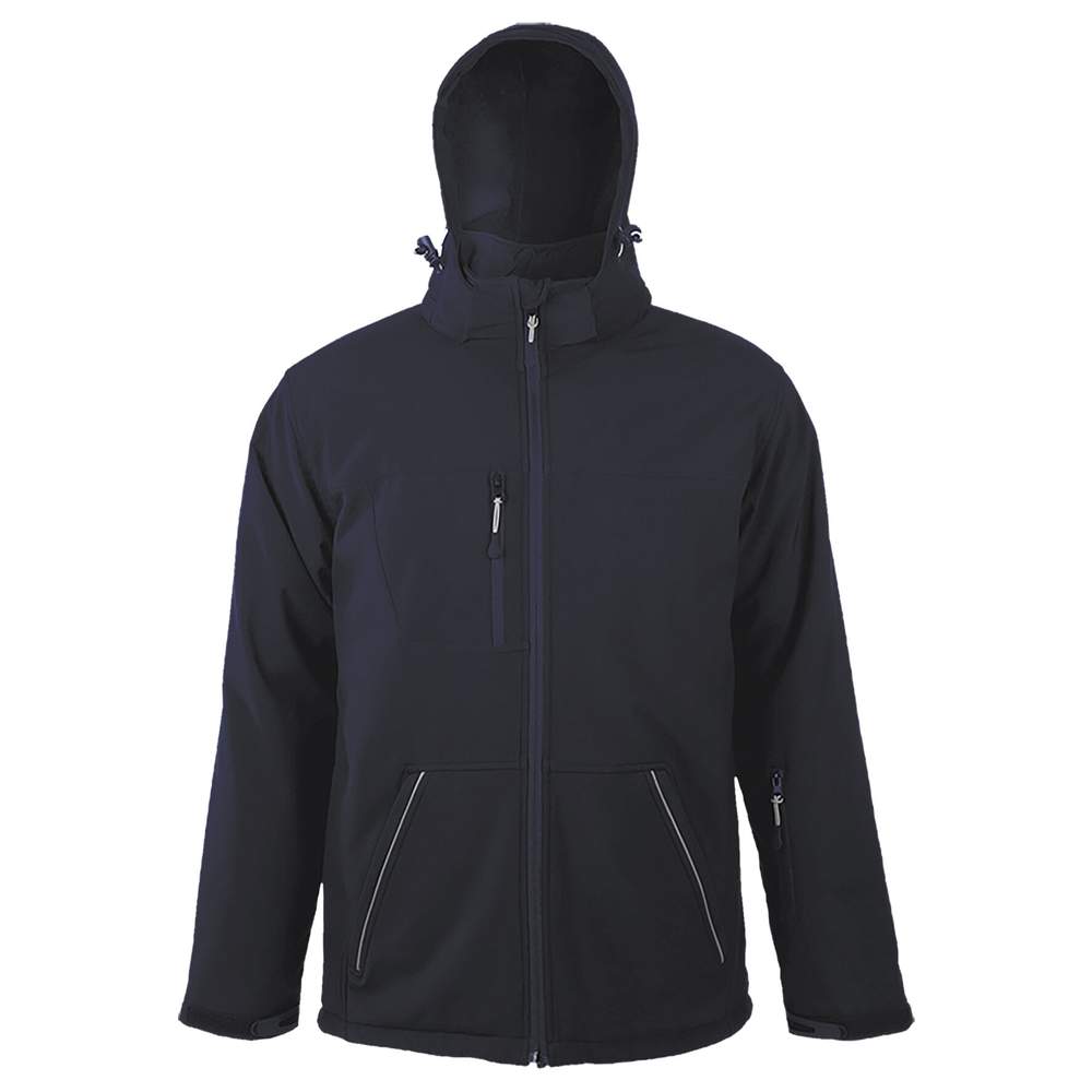 Softshell parka för män. Fullt foderad vintersoftshell. Avtagbar, justerbar kapuschong med visir och dragband med stoppare. Justerbart limband. 3 framluckor med bläck. 1 ärmslucka. 1 inre lucka. 1 inre nätfack. Ärmar med justerbara band med elastiska strykningar på insidan. Dragband för att dra ihop nederdelen av klädet.