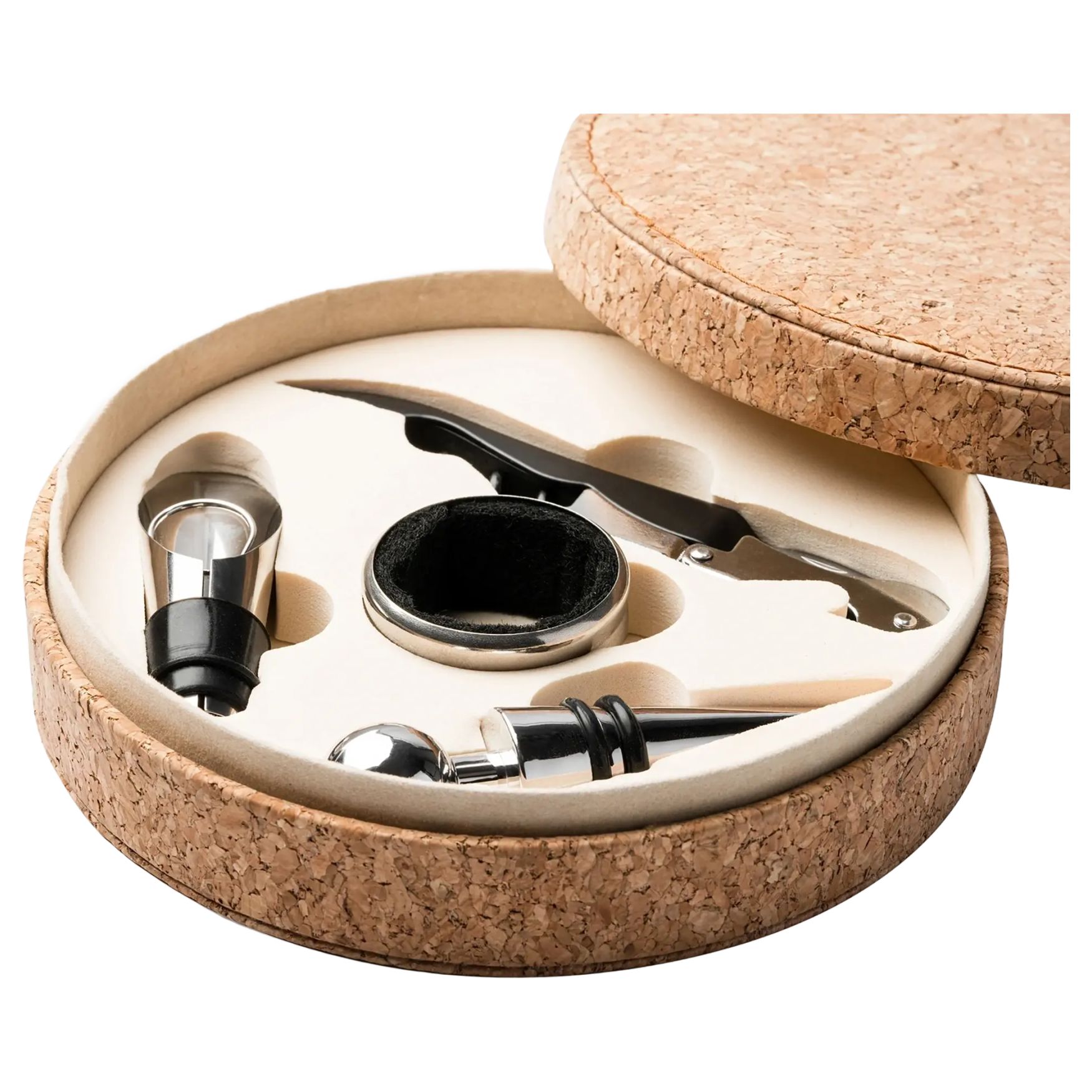Venet vinset samlar tillbehör i rostfritt stål och kork för öppning och servering. Setet innehåller en tvåstegs korkskruv med kapsylskärare och en droppkork med pip.