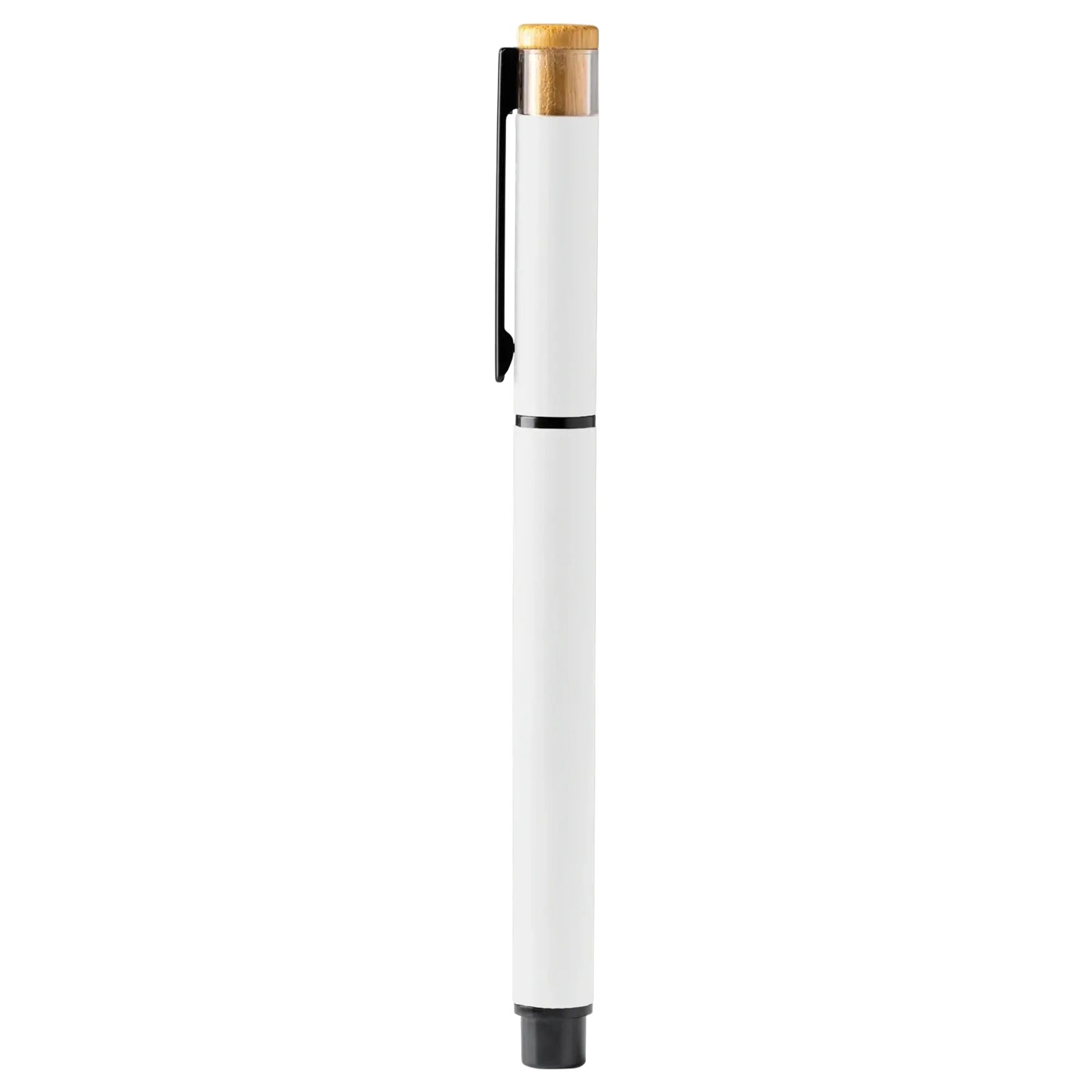 Lindberg kulspetspenna i återvunnet aluminium med metallclips och bambudetalj, lämplig för vardagligt skrivande. Blå jumbo-bläckpatron.