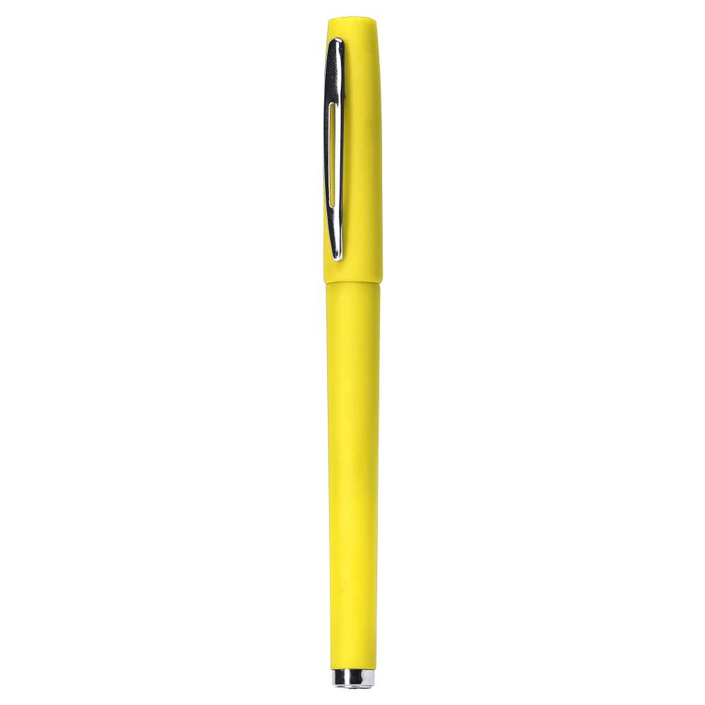 Rullande pennor med klämma och spets i metall. Hölster och lock av samma färg och mjuk att ta på. Jumboladdning på 0,7 mm med blå bläck.