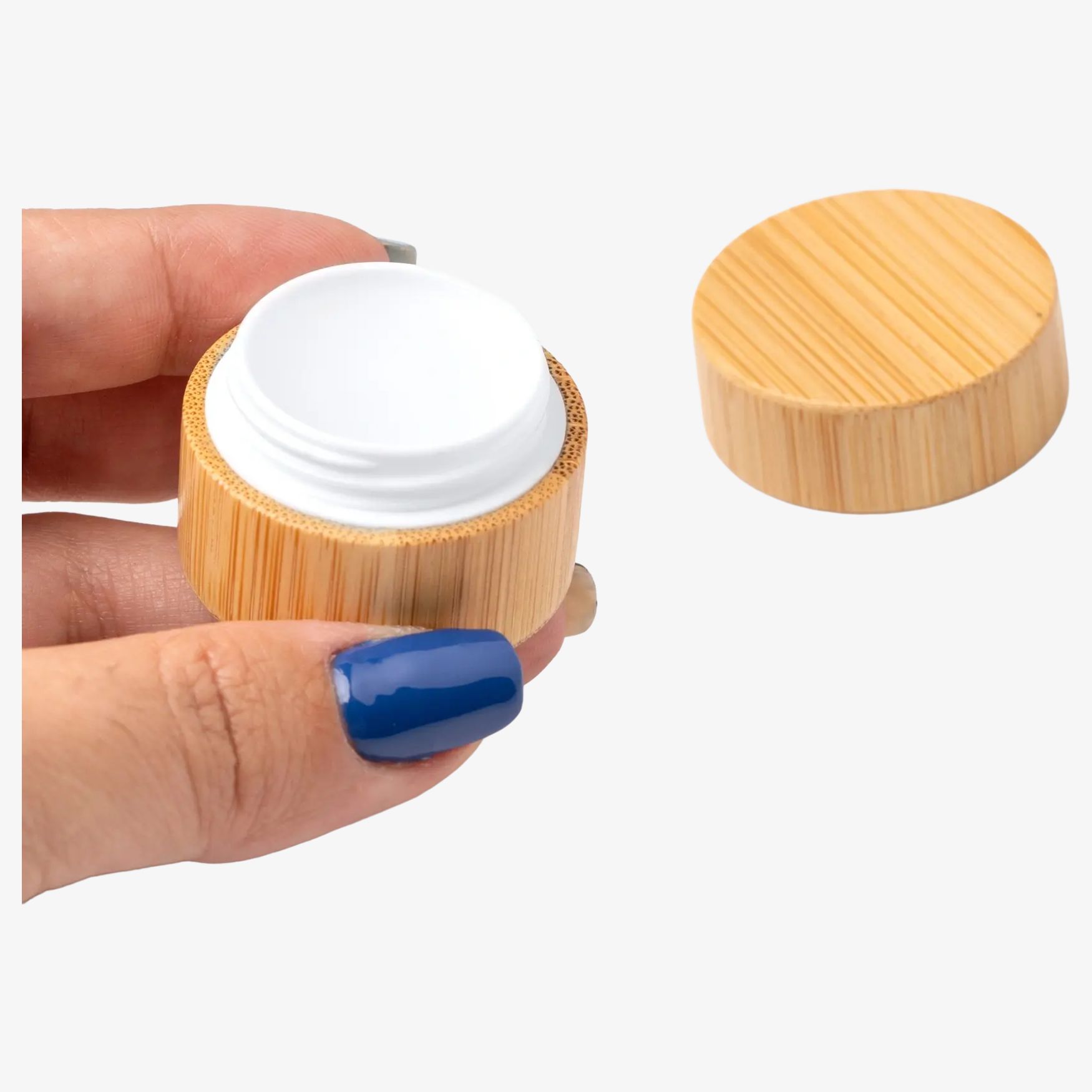 Bledax läppbalsam i ett bambufodral med SPF15-skydd och vaniljarom. Kompakt format, lämpligt för daglig transport.