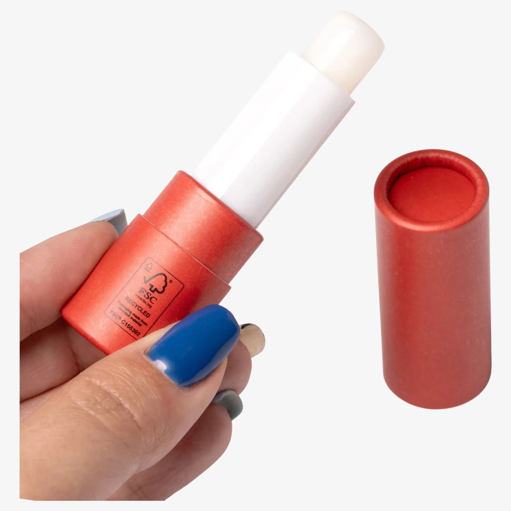 Riba läppbalsam levereras i ett fodral av återvunnen kartong, med SPF15-skydd och vaniljarom. Kompakt format, mått 8 x 2 cm.