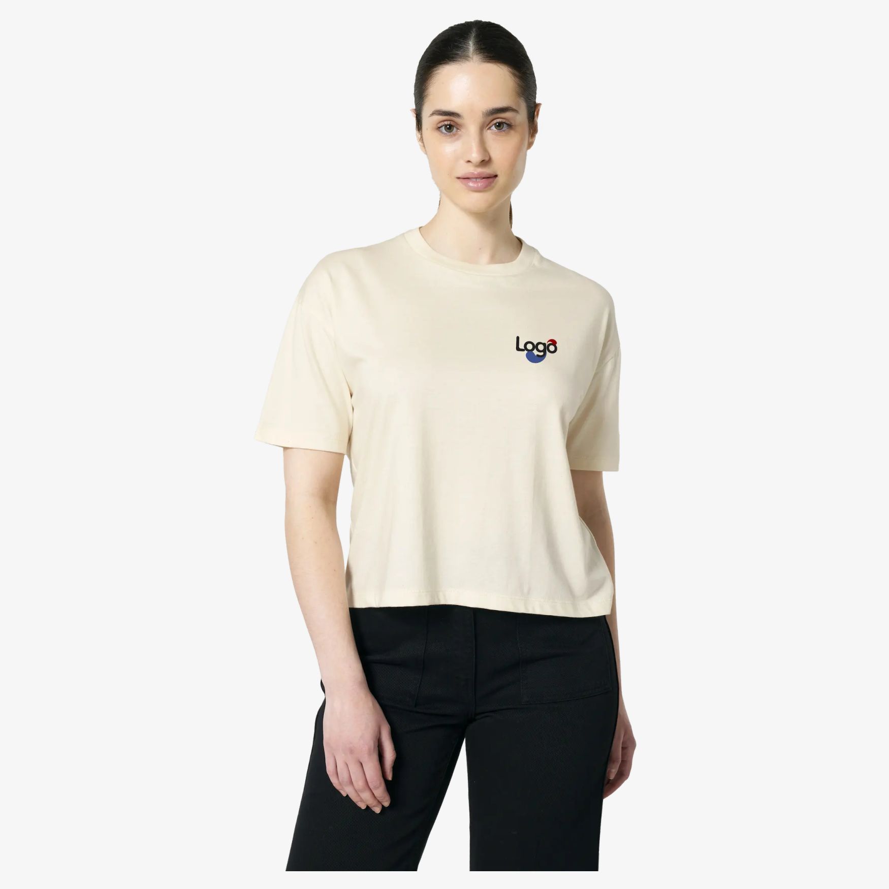 Den här boxy T-shirten för damer är tillverkad i 100% biologisk bomull, grynad och kamgarn. Den har monterade ärmar, bordsrubbar 1x1 i halsen, på ärmarna och i kanten samt en rengöringsremsa inuti halsen i huvudmaterialet. Ärmarna och kanten är försedda med dubbla smala stygn. Denna modell erbjuder en ideal bas för anpassning med ditt logotyp eller visuell.