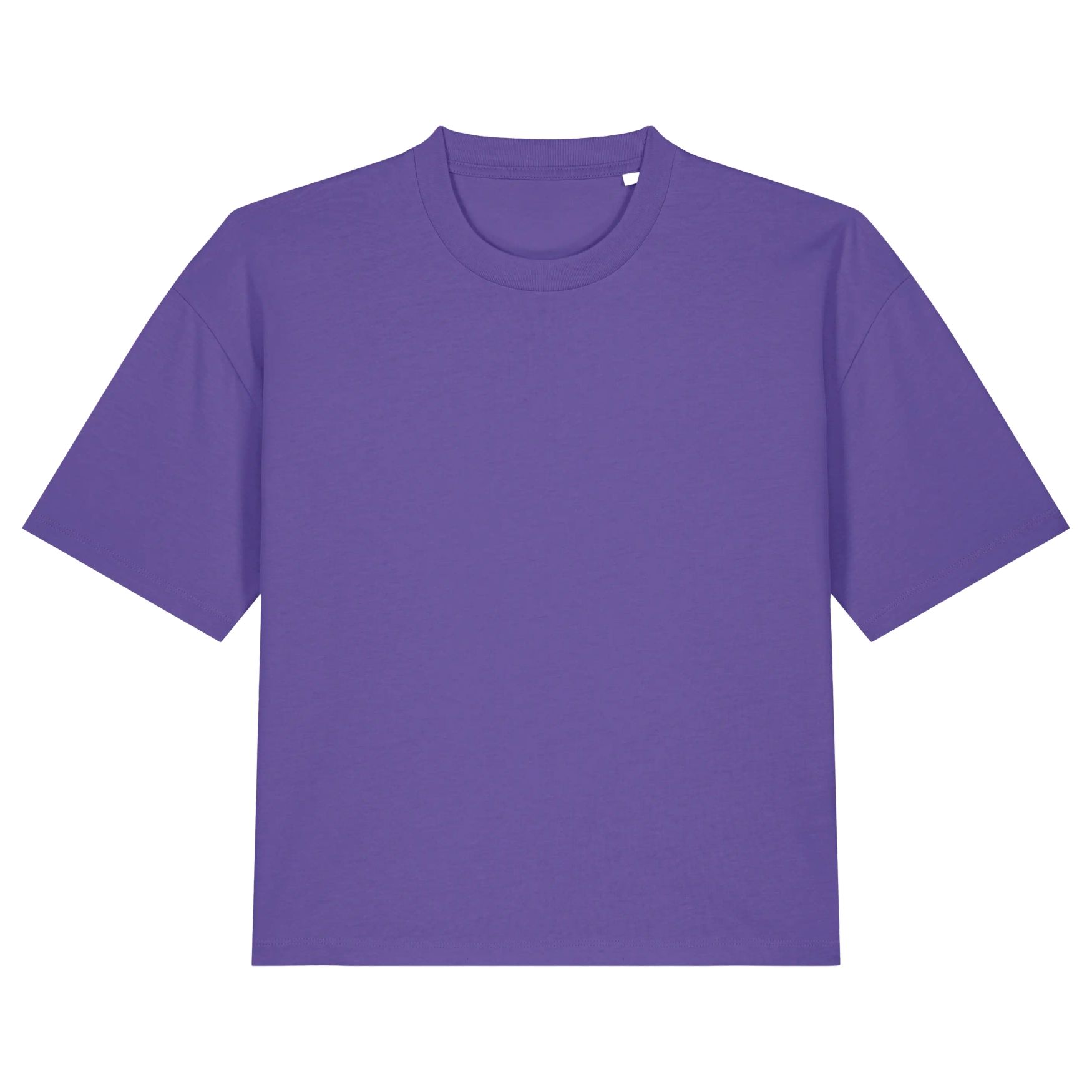 Den här boxy T-shirten för damer är tillverkad i 100% biologisk bomull, grynad och kamgarn. Den har monterade ärmar, bordsrubbar 1x1 i halsen, på ärmarna och i kanten samt en rengöringsremsa inuti halsen i huvudmaterialet. Ärmarna och kanten är försedda med dubbla smala stygn. Denna modell erbjuder en ideal bas för anpassning med ditt logotyp eller visuell.