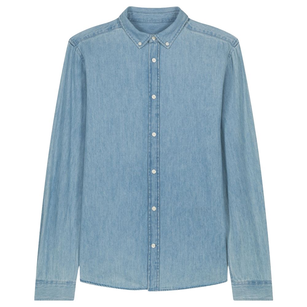 Denimskjorta för herrar Stanley denim skjorta. Knäppkrage med enkel stygning. Kragkant. Knäppning fram med enkel stygning på båda sidor. Förskjutna axlar. Bakstycke. Inre stycke i samma tyg. Ärmar uppsydda. Ärmkant med en knapp. Ärmkanten med två knappar. Ärmkanterna rundade. Dubbla veck vid ärmkanten. Slitet utseende på alla sömmar på grund av tvättning av plagg. Produkt färgad med indigo tråd, varje plagg kan variera i utseende, färgen kan blöda, följ vår vårdetikett. Sammansättning : 100% biologisk bomull spinnad och kamnad. Denna skjorta är idealisk för brodering, vilket gör att du kan lägga till ditt logotyp eller din visuell för effektiv kommunikation.