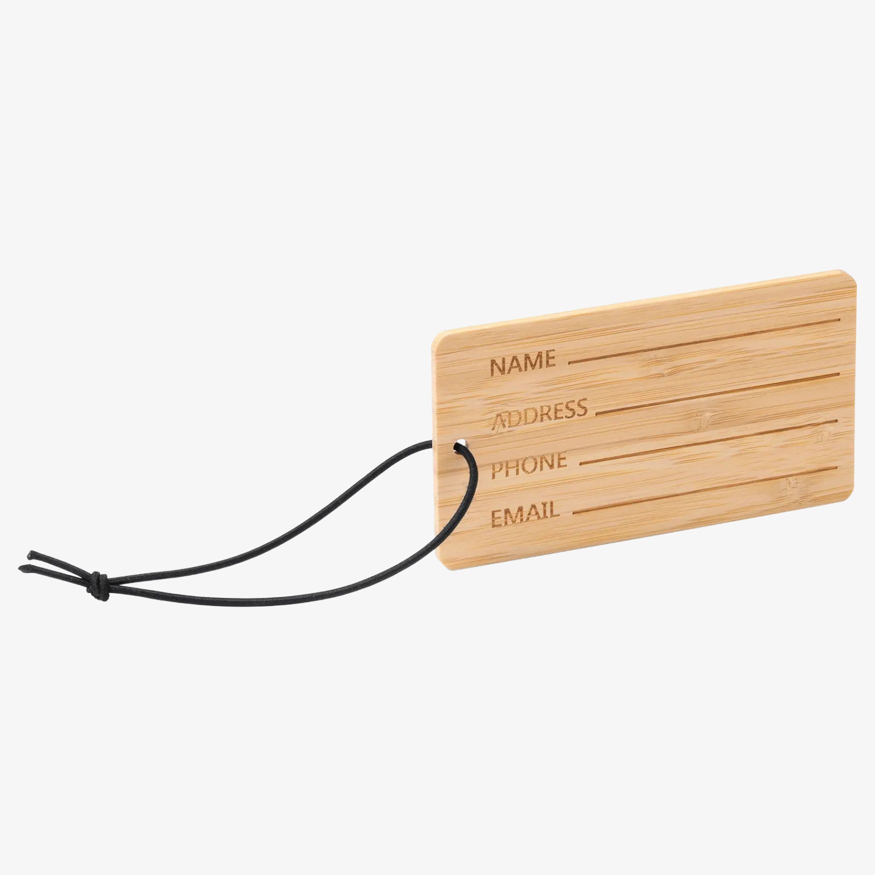 Baggageetiketten KABORE är tillverkad av bambu och utrustad med en svart elastisk rem. Den mäter 11 x 3 x 6 cm, vilket möjliggör enkel fastsättning på olika bagage.