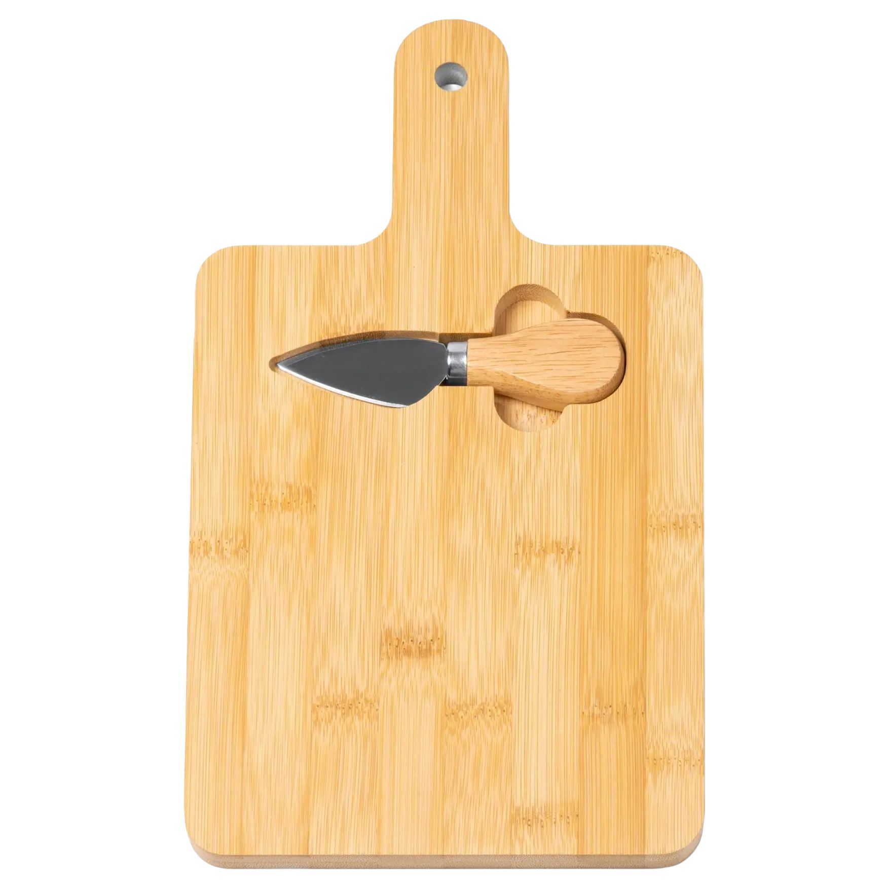 Bambuskärbrädan har ett handtag för bekväm hantering och inkluderar en speciell ostkniv i rostfritt stål. Den kombinerar förberedelse och servering i ett set.