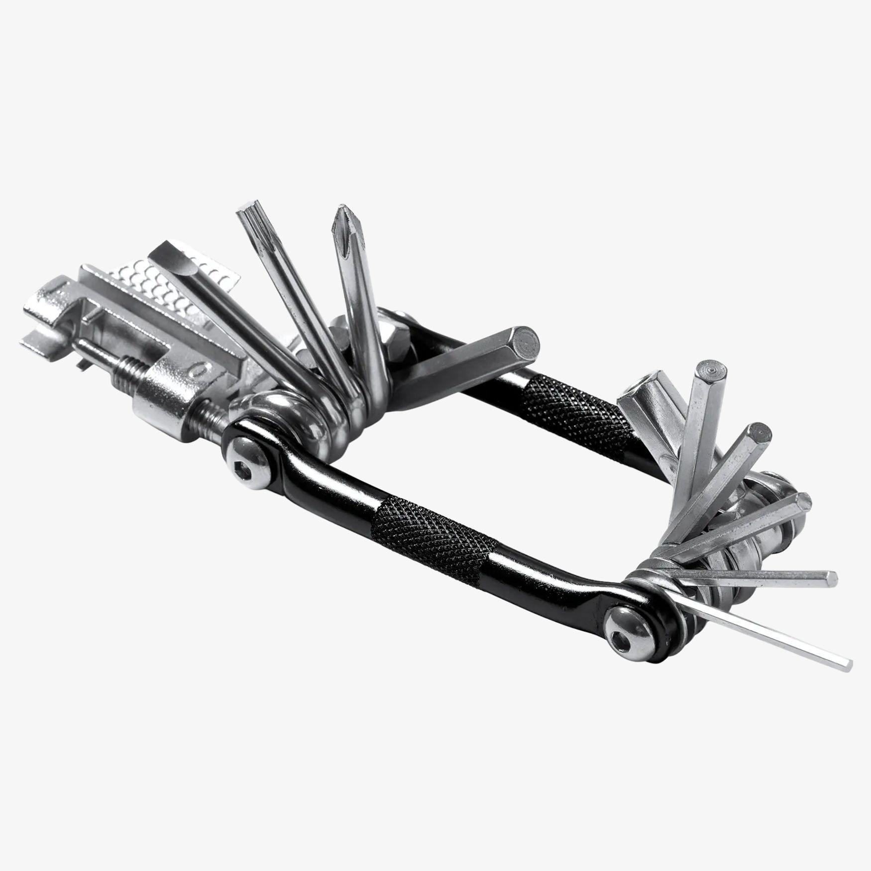 SORBY multifunktionsverktyg i rostfritt stål har en kompakt design med 11 inbyggda funktioner, inklusive skruvmejsel och kedjeverktyg. Dess små mått underlättar transport och användning.