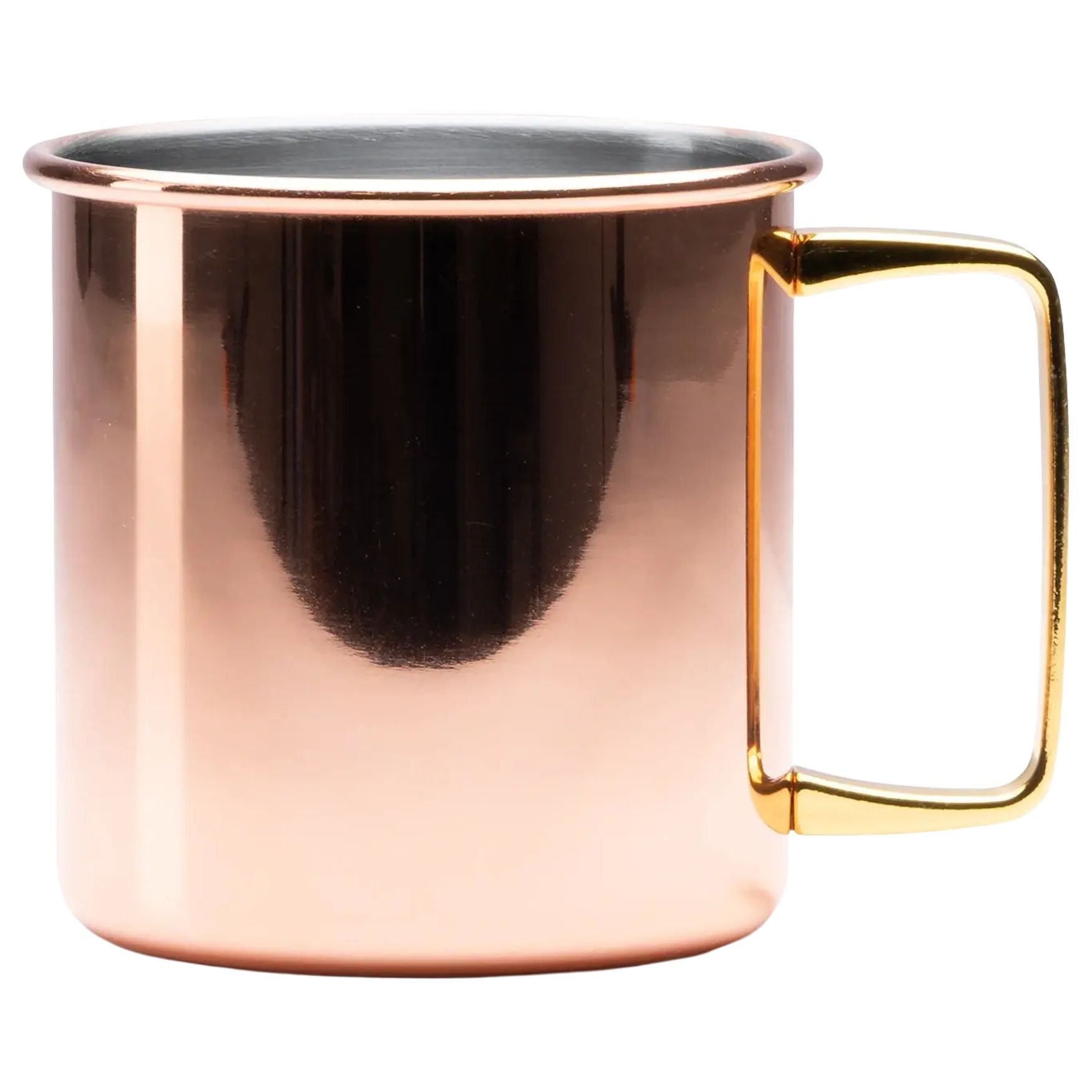 The LIRIA stainless steel mug has a capacity of 480 ml. Its copper exterior coating helps maintain beverage temperature while the golden handle facilitates grip.