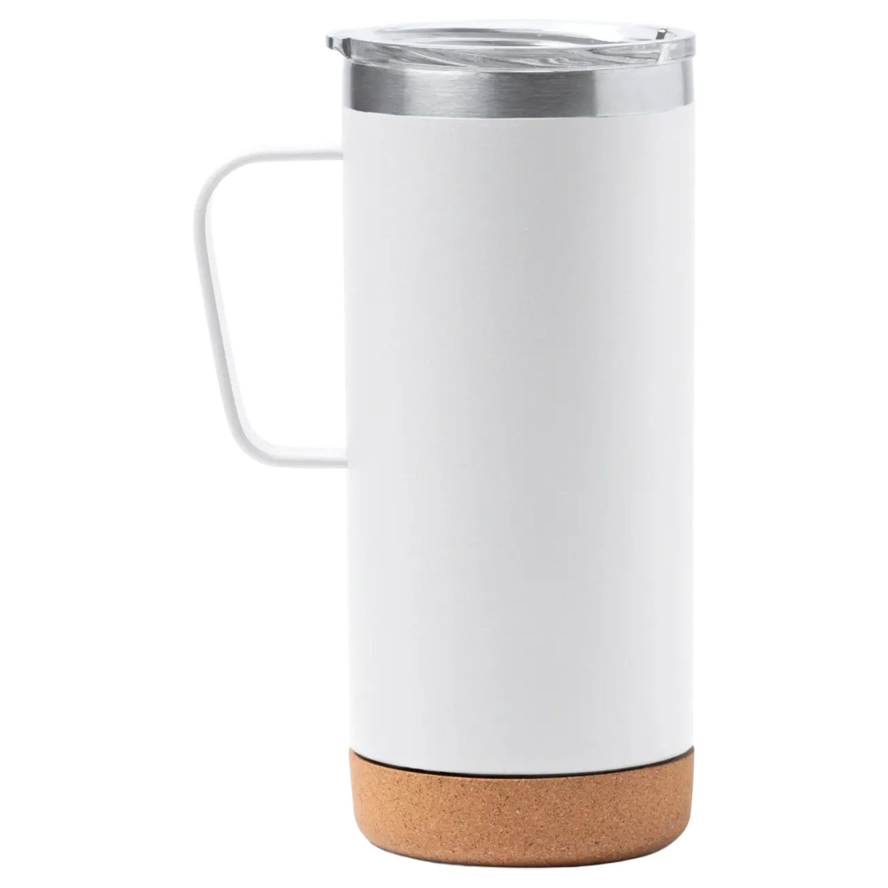 BEYRON är en dubbelväggig mugg i återvunnet rostfritt stål med korkbas och genomskinligt säkerhetslock. Kapaciteten är 600 ml, lämplig för olika vardagliga användningar.