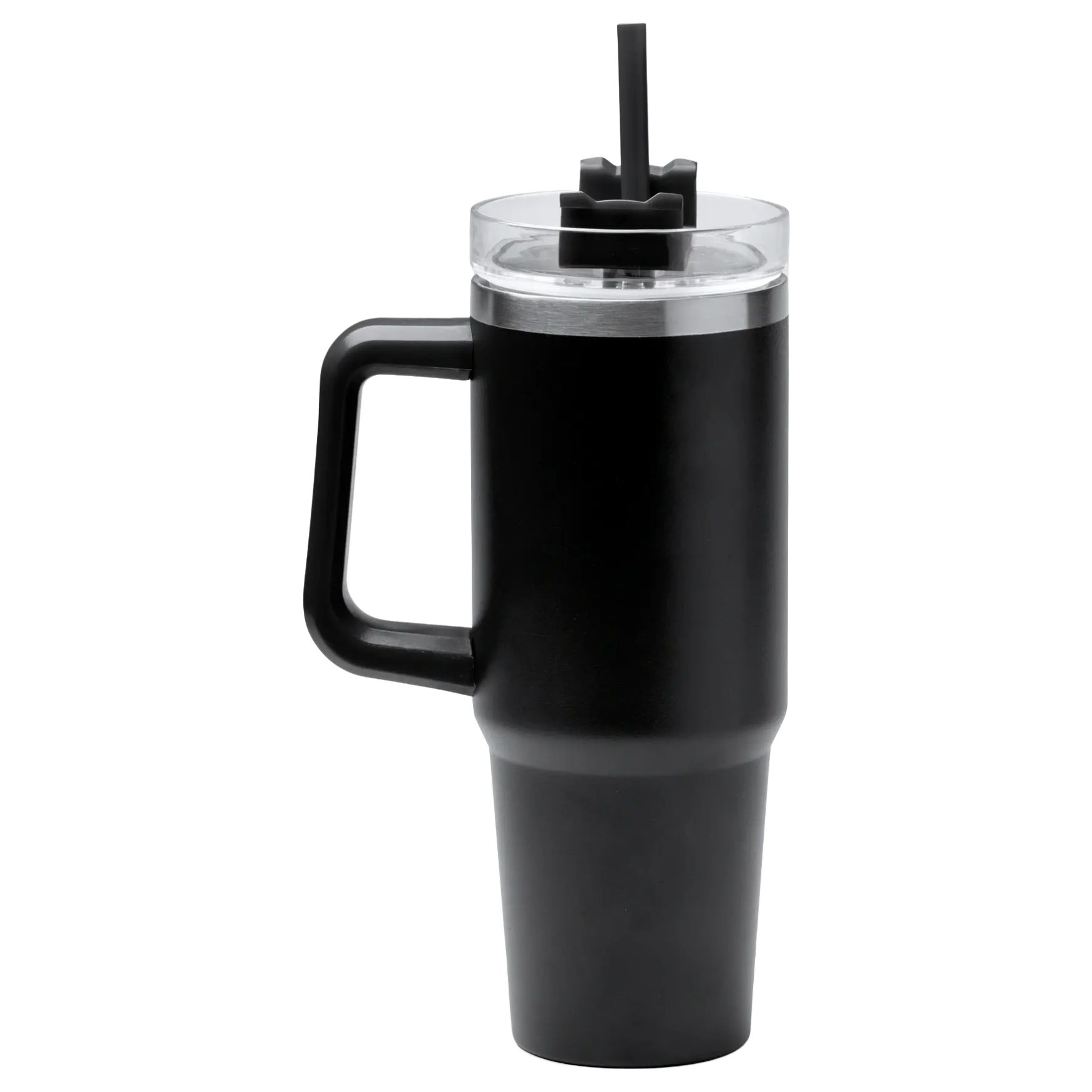 KRANSTON termosmugg i återvunnet rostfritt stål 304, med dubbelvägg, håller varma eller kalla drycker längre. Skruvlocket minskar läckage och sugröret underlättar användning i vardagen. Volym 870 ml.