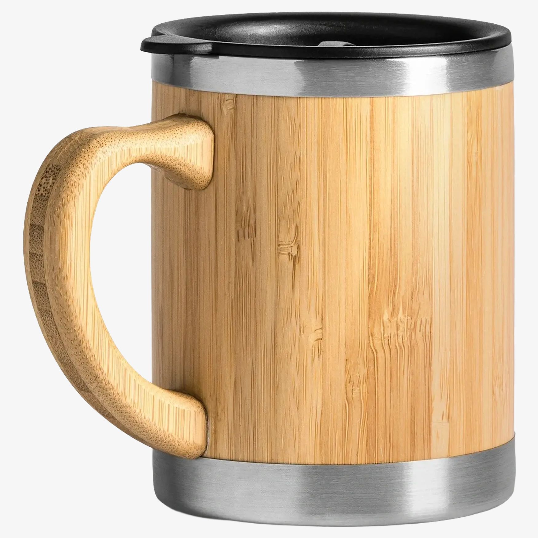 PANA rostfritt stålmugg är utrustad med dubbelvägg och doseringslock. Dess kapacitet är 340 ml med bambuyttermaterial. Denna modell kombinerar dessa material för anpassad användning.