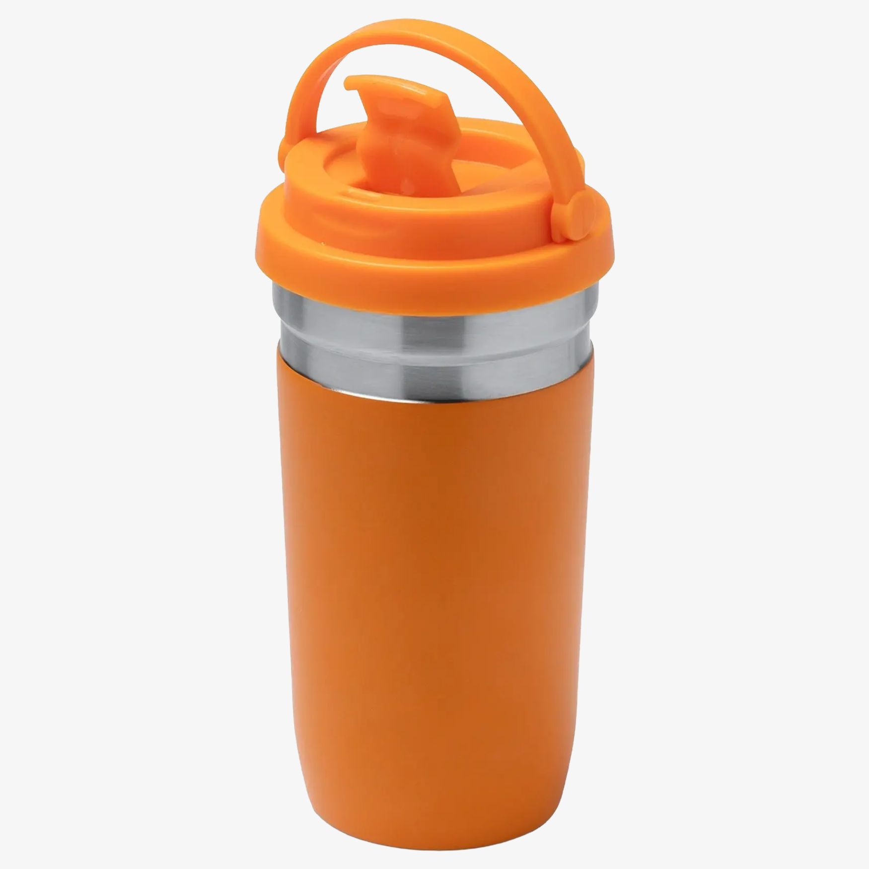 GREDOS termomugg med handtag i rostfritt stål med dubbelvägg och matt yta passar för transport av varma eller kalla drycker. Skruvat lock med drickpip och halkfri bas underlättar användning i vardagen, på kontoret eller på språng.