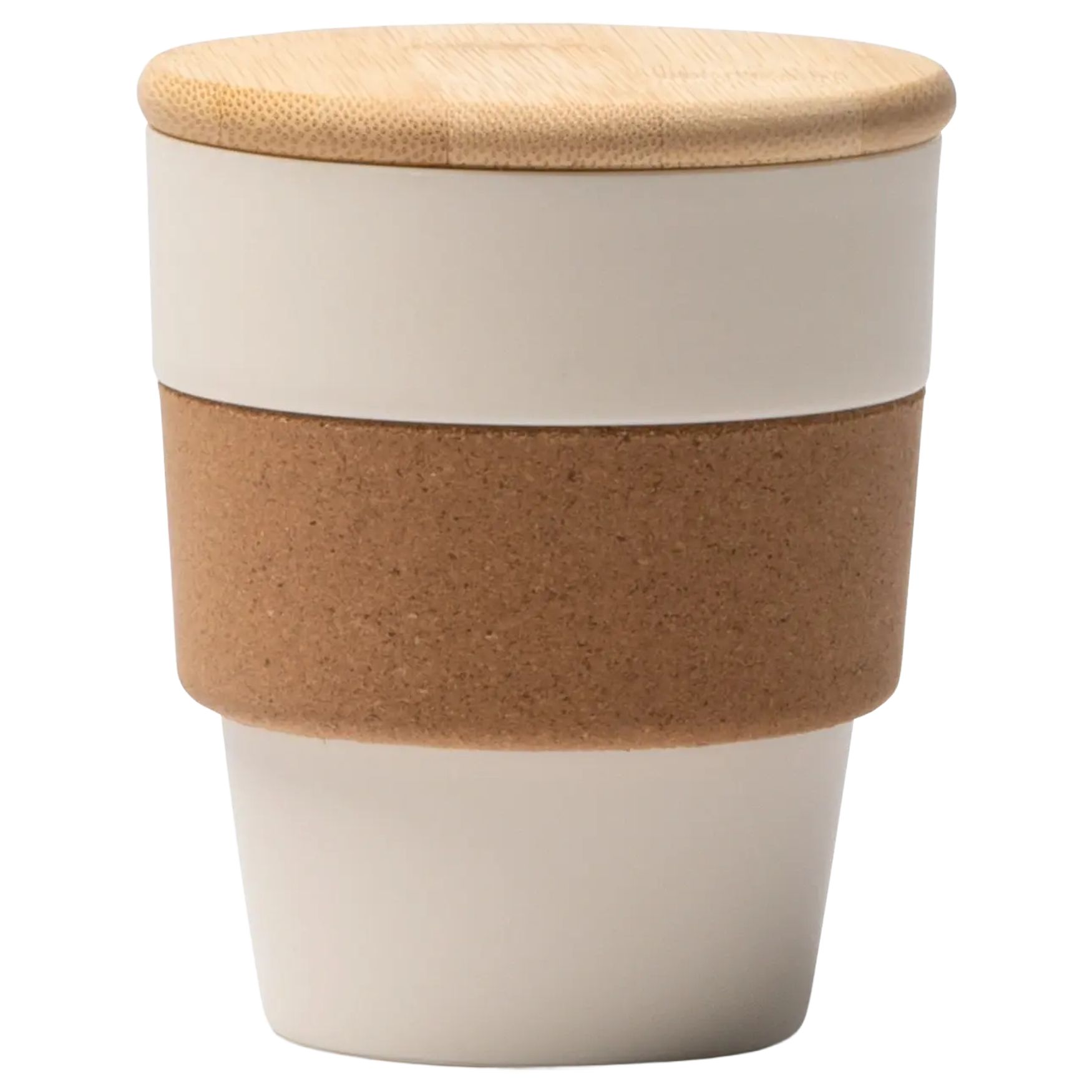 LOVREN bägare 350 ml va1676 för varma eller kalla drycker, med en kropp i återvunnen polypropen, ett korkband och ett lock i bambu. Mått 10,5 x 9 cm.