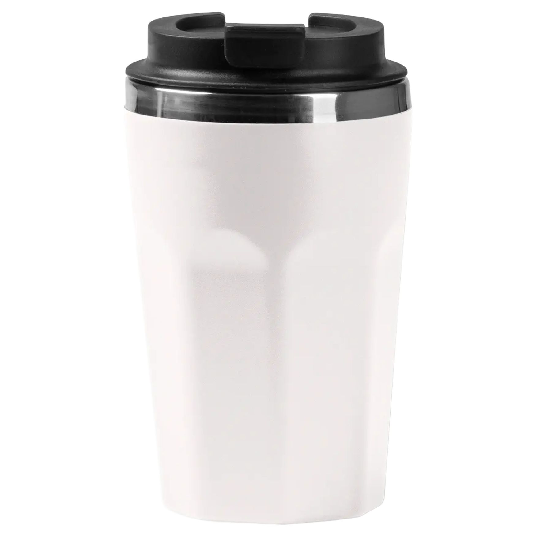 SALMER är en dubbelväggig bägare, med insida i rostfritt stål 304 och utsida i återvunnen polypropen. Den avfasade formen underlättar greppet. Kapacitet 400 ml, mått 16 x 9 cm.