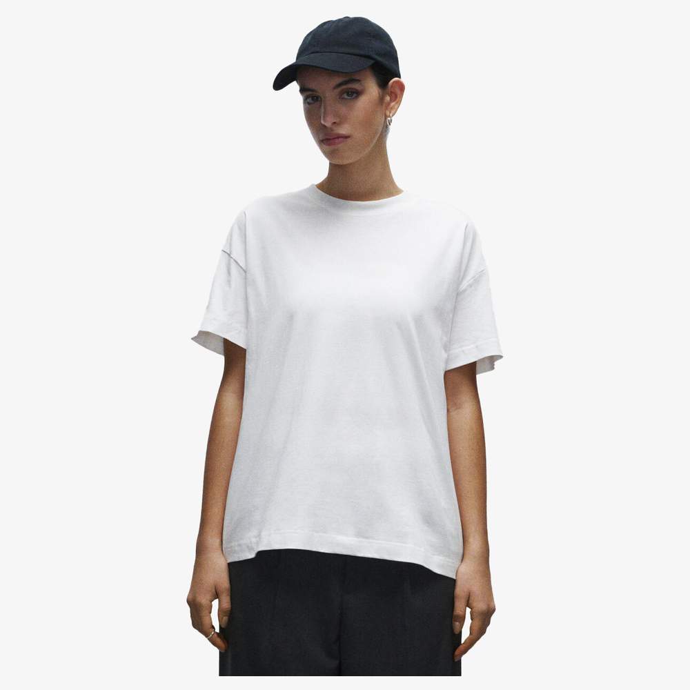 Detta översized t-shirt för damer erbjuder en bred och kvadratisk passform, med sänkt axel och en förlängd och tjock rundhals. Det har dubbelsting i ärmhålorna och vid den förlängda plissen. Axelns stängda sömmar förstärks med ett halsband och dubbelsting över sömmen. Sydd i enkel medeltyngd jersey, ger detta plagg daglig komfort.