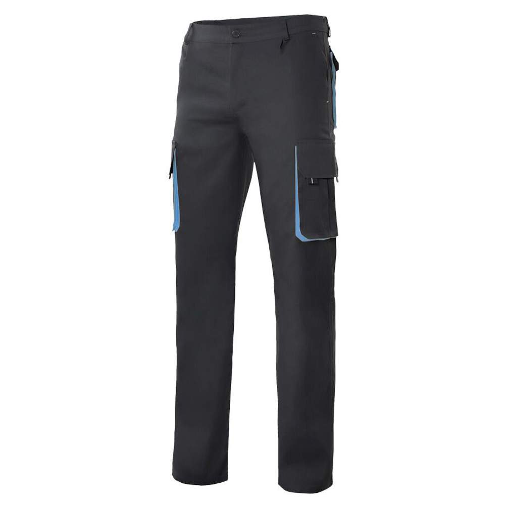 Tvåfärgad arbetsbyxa med flera fickor, konstruerad för att erbjuda komfort och funktion. Den har en knappstängning med zip och baksida med förstärkt tyg för ökad hållbarhet. Elastisk midja för bekväm passform. Sydda för ökad motståndskraft. Denna byxa har sex fickor: två sidor, två lårfickor med flik, velcro och glidlås