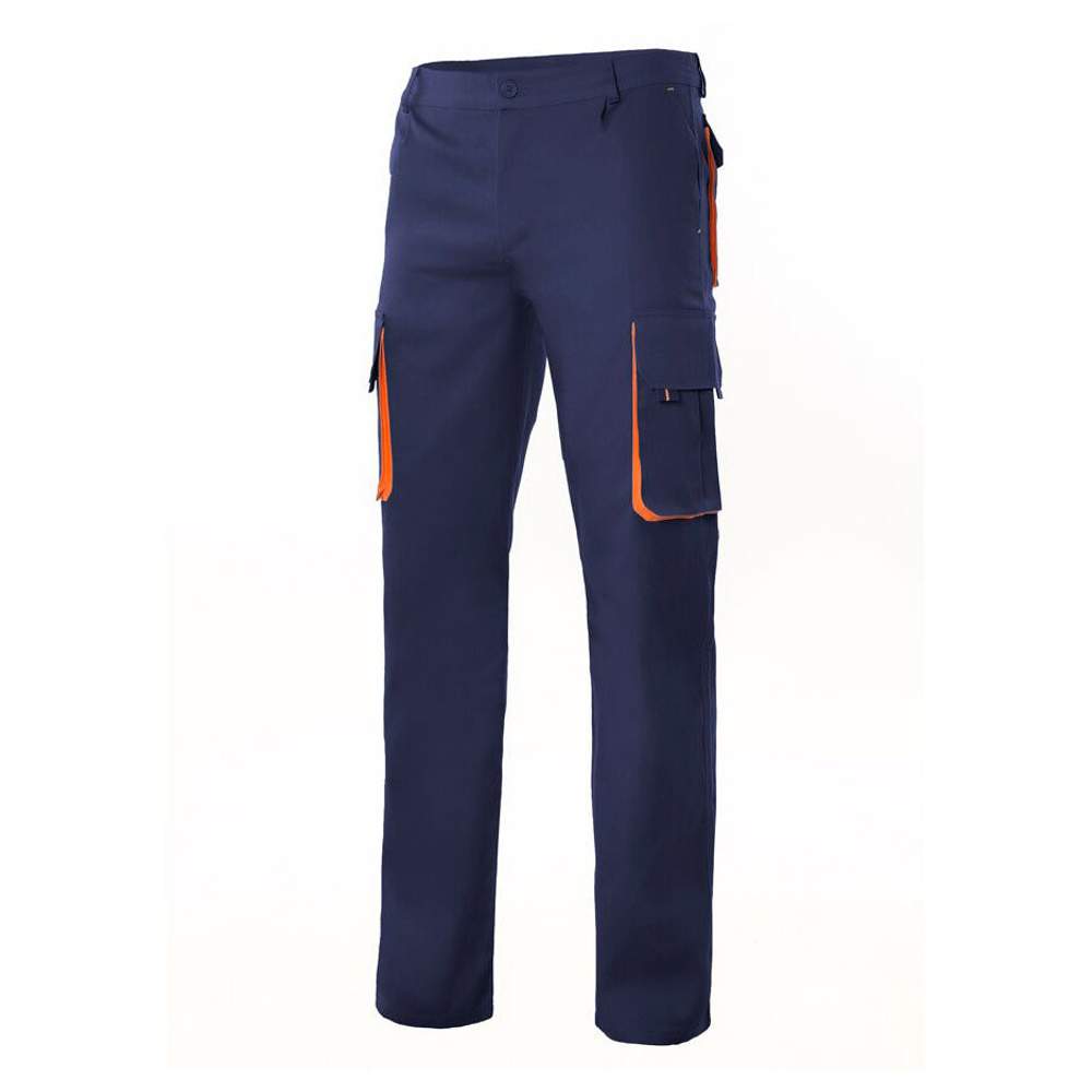 Tvåfärgad arbetsbyxa med flera fickor, konstruerad för att erbjuda komfort och funktion. Den har en knappstängning med zip och baksida med förstärkt tyg för ökad hållbarhet. Elastisk midja för bekväm passform. Sydda för ökad motståndskraft. Denna byxa har sex fickor: två sidor, två lårfickor med flik, velcro och glidlås