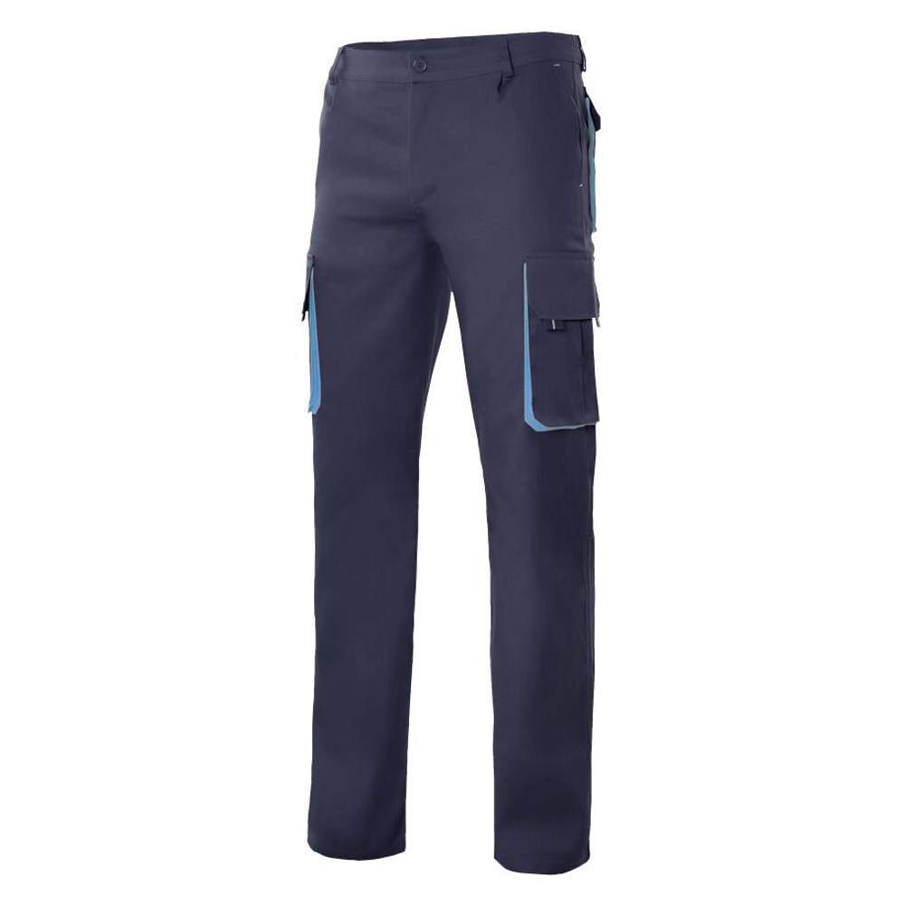 Tvåfärgad arbetsbyxa med flera fickor, konstruerad för att erbjuda komfort och funktion. Den har en knappstängning med zip och baksida med förstärkt tyg för ökad hållbarhet. Elastisk midja för bekväm passform. Sydda för ökad motståndskraft. Denna byxa har sex fickor: två sidor, två lårfickor med flik, velcro och glidlås