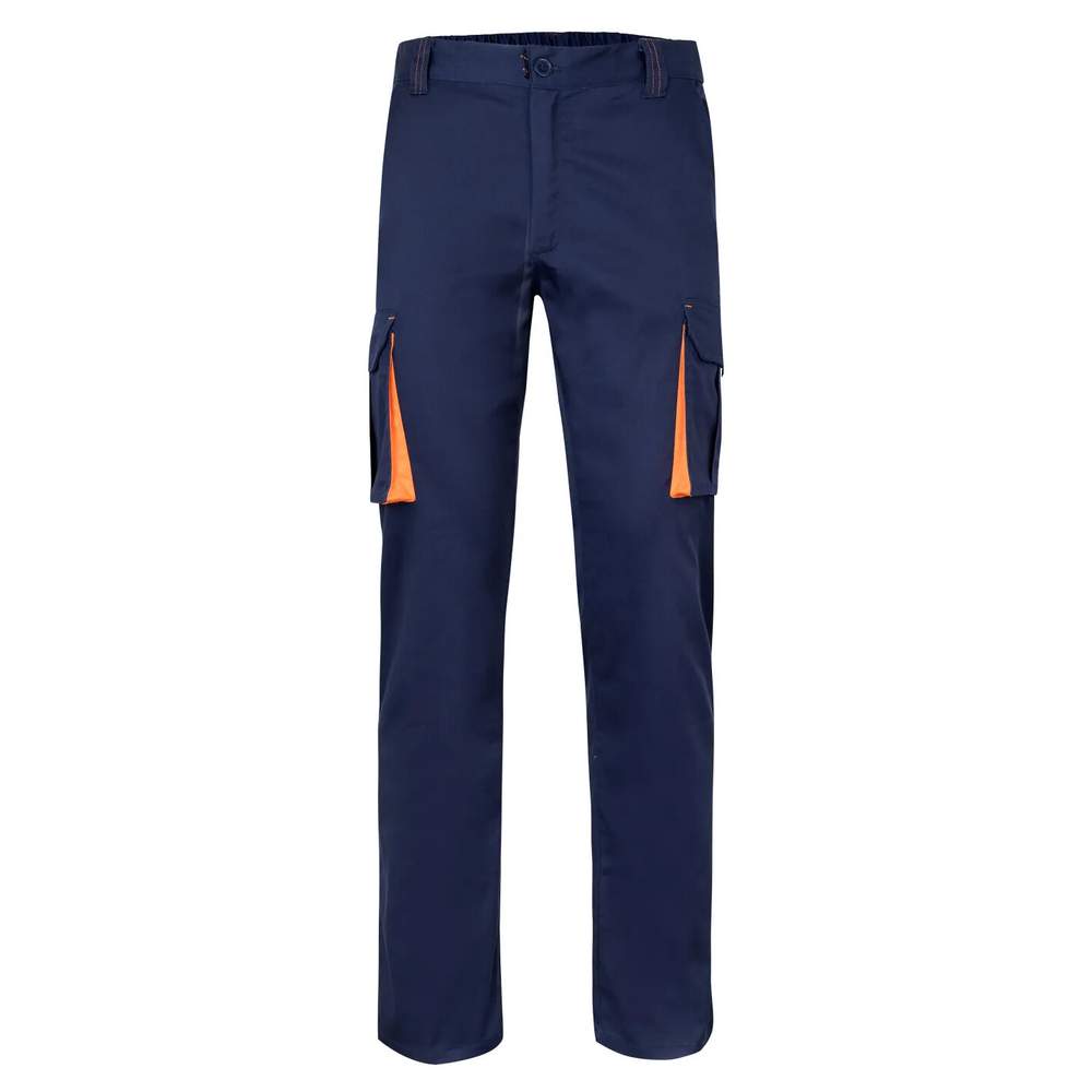 Tvåfärgad arbetsbyxor med flera fickor utformade för optimal komfort och ökad funktionalitet. Den har en central glidlås och en knapp. Färgkontrast finns på klämmorna, glidarna och sömmarna. Midjan är elastisk för en bekväm passform. Den har sex praktiska fickor: två franska fickor, två fickor med dubbel klämmning, en autoaggreppande rem och glidare, och två baksäckor med klämmning, autoaggreppande rem och glidare.
