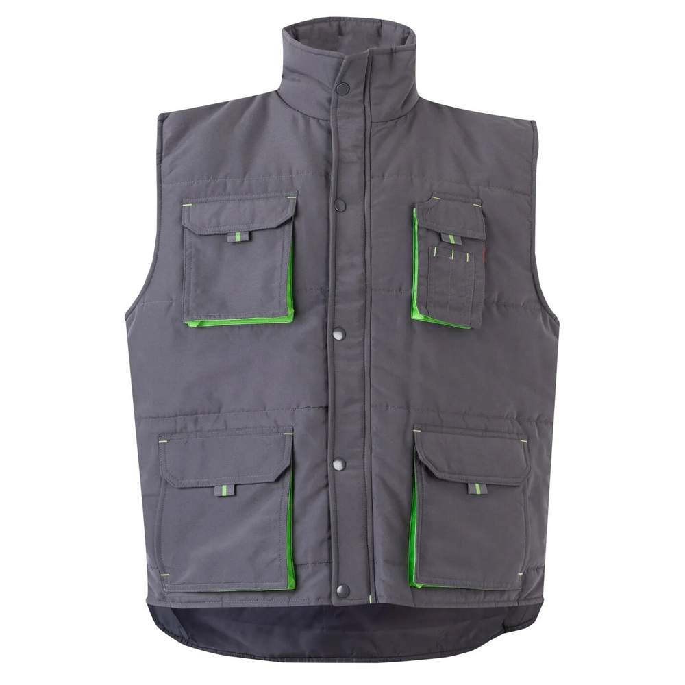 Arbetsvesta utan ärmar som är konstruerad för att erbjuda komfort och funktion. Den har en central zipplåsning och kontrastfärgade ficklappar för större kapacitet och lätt åtkomst. Kontrastfärgade dragkedjor lägger till en distinkt visuell detalj. Denna vesta är utrustad med sju praktiska fickor: en bröstficka med ficklappar, dragkedja och fästband, två framfickor med ficklappar, dragkedja och fästband, och två sidfickor underifrån. En extra bröstficka med ficklappar erbjuder förvaringsutrymme med fästband, dragkedjor och pennafack. En inre plattficka låter dig säkert förvara personliga föremål. Ficklappar med tryckknappar säkerställer säker stängning. Årmhålsinsatser mot vinden erbjuder ytterligare skydd mot väderleken.