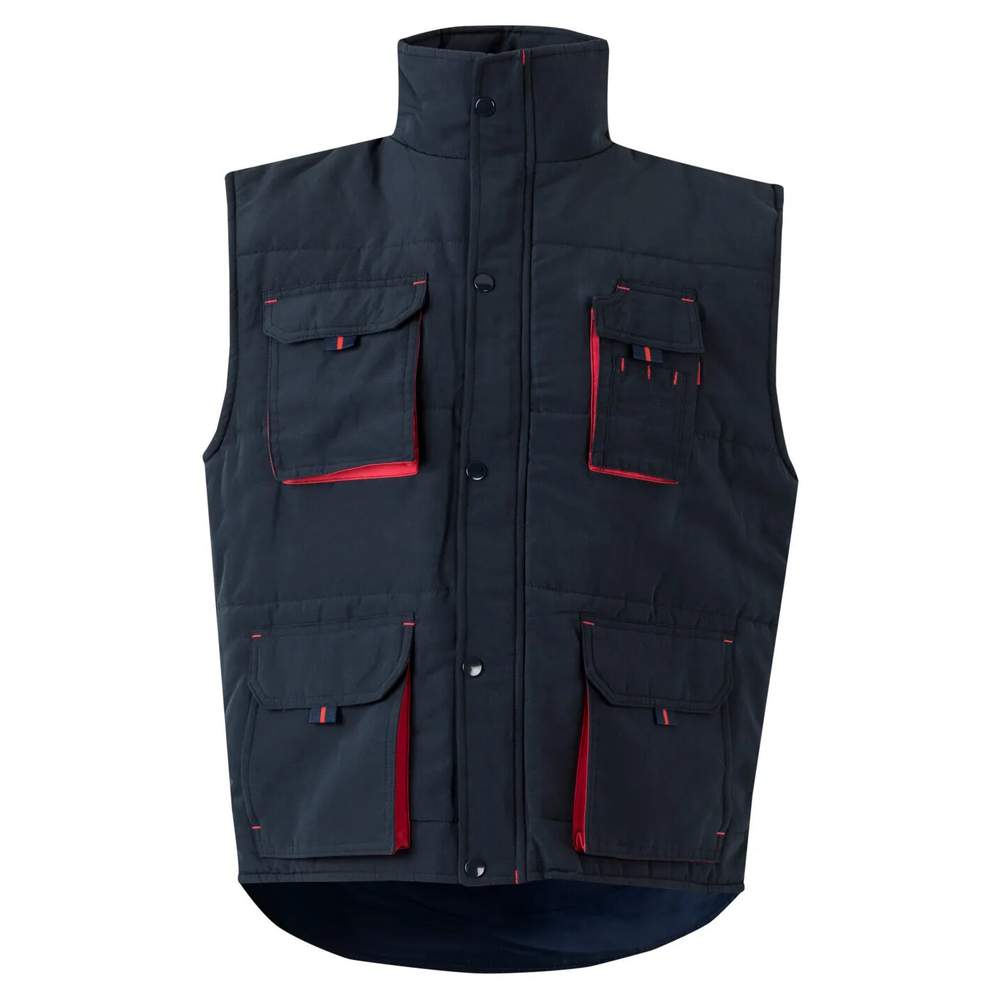 Arbetsvesta utan ärmar som är konstruerad för att erbjuda komfort och funktion. Den har en central zipplåsning och kontrastfärgade ficklappar för större kapacitet och lätt åtkomst. Kontrastfärgade dragkedjor lägger till en distinkt visuell detalj. Denna vesta är utrustad med sju praktiska fickor: en bröstficka med ficklappar, dragkedja och fästband, två framfickor med ficklappar, dragkedja och fästband, och två sidfickor underifrån. En extra bröstficka med ficklappar erbjuder förvaringsutrymme med fästband, dragkedjor och pennafack. En inre plattficka låter dig säkert förvara personliga föremål. Ficklappar med tryckknappar säkerställer säker stängning. Årmhålsinsatser mot vinden erbjuder ytterligare skydd mot väderleken.