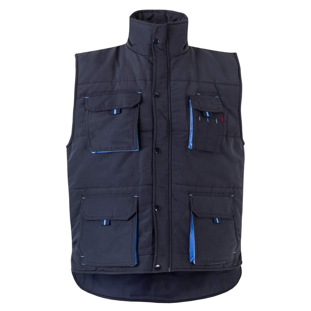 Arbetsvesta utan ärmar som är konstruerad för att erbjuda komfort och funktion. Den har en central zipplåsning och kontrastfärgade ficklappar för större kapacitet och lätt åtkomst. Kontrastfärgade dragkedjor lägger till en distinkt visuell detalj. Denna vesta är utrustad med sju praktiska fickor: en bröstficka med ficklappar, dragkedja och fästband, två framfickor med ficklappar, dragkedja och fästband, och två sidfickor underifrån. En extra bröstficka med ficklappar erbjuder förvaringsutrymme med fästband, dragkedjor och pennafack. En inre plattficka låter dig säkert förvara personliga föremål. Ficklappar med tryckknappar säkerställer säker stängning. Årmhålsinsatser mot vinden erbjuder ytterligare skydd mot väderleken.