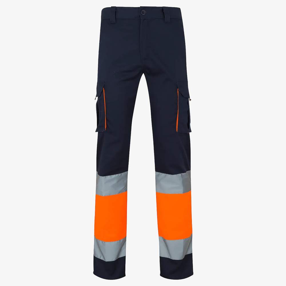 Tvåkfärgad stretchbyxa med hög synlighet designad för att erbjuda komfort och säkerhet. Den har en central zippfästning med knapp, samt en färgkontrast på flikarna, glidarna, sömmarna och tyget mellan banden. Midjan är elastisk för optimal passform. Reflekterande band finns på benens nedre del för bättre synlighet. Denna byxa har dubbla sömmar för ökad hållbarhet. Den har sex fickor: två franska fickor, två fickor med flik, en dubbel mittflik med klämtap och glidare, samt två baksida fickor med flik, också med klämtap och glidare.