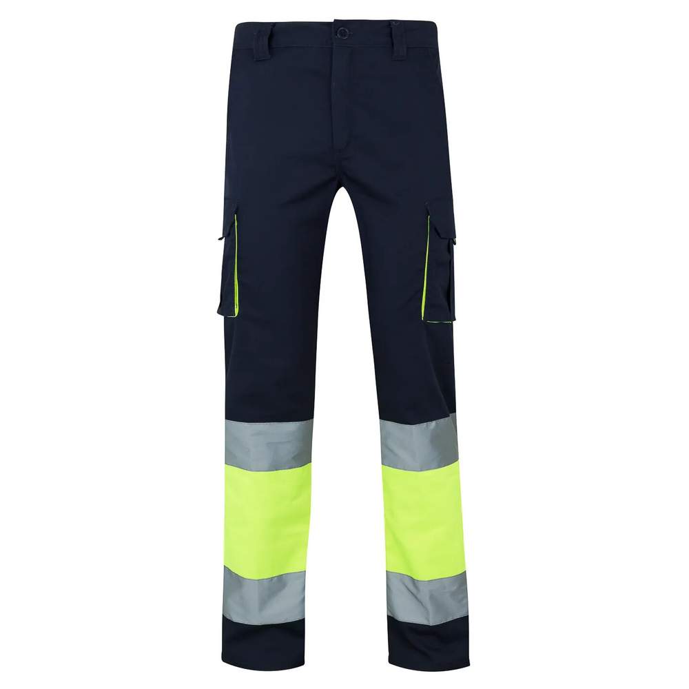 Tvåkfärgad stretchbyxa med hög synlighet designad för att erbjuda komfort och säkerhet. Den har en central zippfästning med knapp, samt en färgkontrast på flikarna, glidarna, sömmarna och tyget mellan banden. Midjan är elastisk för optimal passform. Reflekterande band finns på benens nedre del för bättre synlighet. Denna byxa har dubbla sömmar för ökad hållbarhet. Den har sex fickor: två franska fickor, två fickor med flik, en dubbel mittflik med klämtap och glidare, samt två baksida fickor med flik, också med klämtap och glidare.