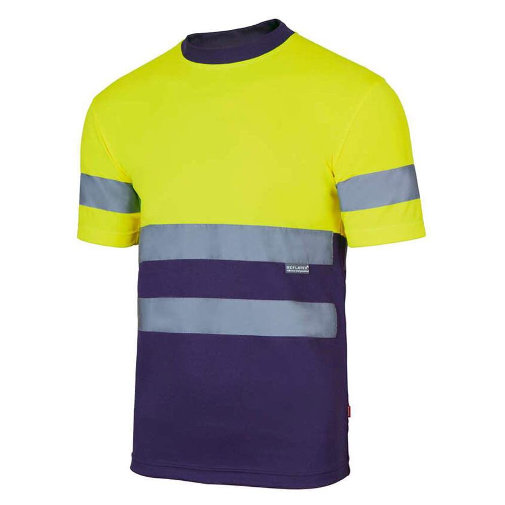 Tvåfärgad högvisibilitetst-shirt, utformad för att erbjuda utmärkt säkerhet och synlighet i olika förhållanden. Den har en rund halsring med kontrasterande kanter och reflekterande band över bröstet och ärmarna, i enlighet med normen EN20471:2013 Klass 1. Dess sammansättning i 100% polyester säkerställer optimal komfort och god hållbarhet. Denna t-shirt är personaliserbar och låter dig lägga till ditt logotyp eller visuell för en tydlig och professionell identifikation.
