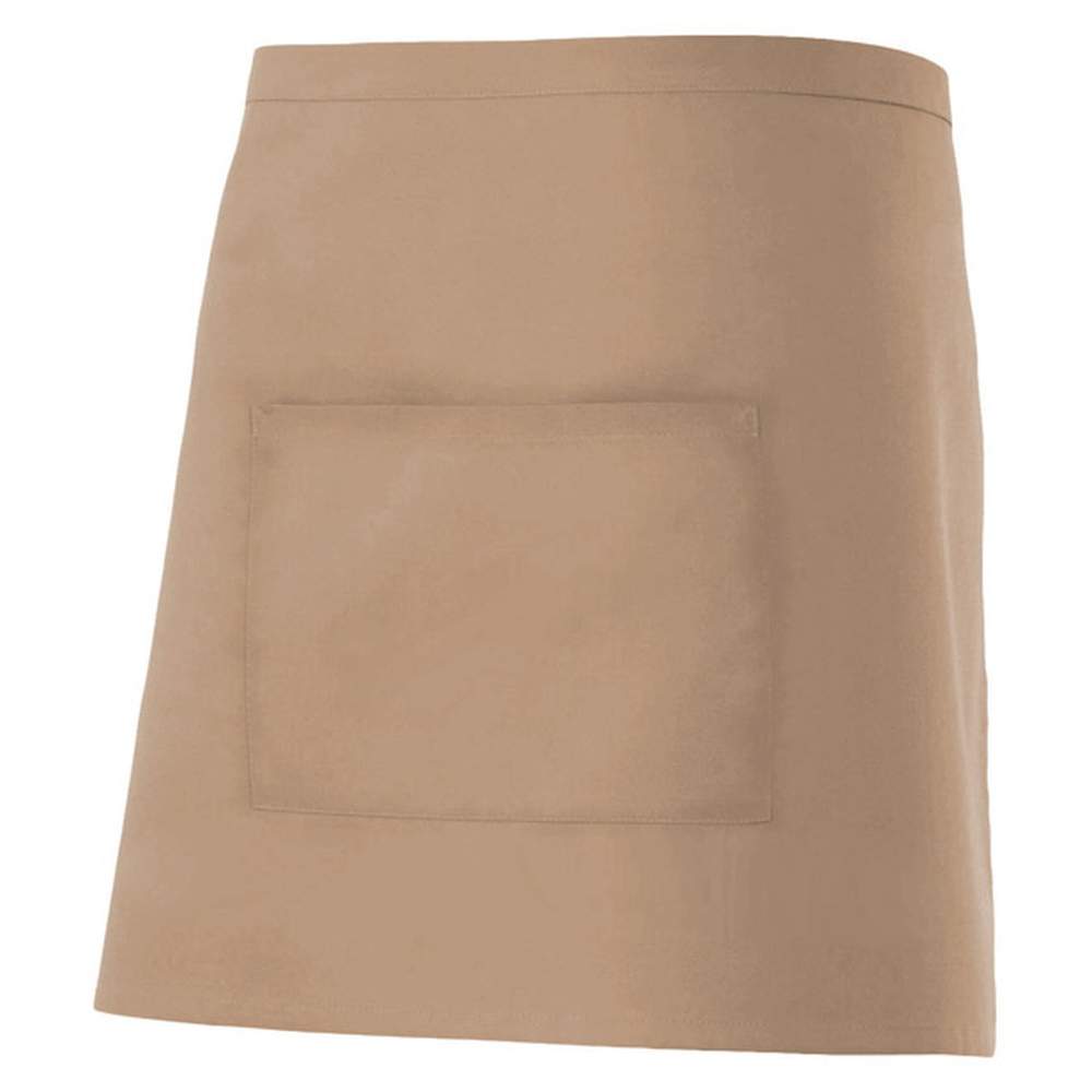 Halvlangt förkläde konstruerat för mångsidig användning. Det är utrustat med två band vid ändarna för säker passform och har en praktisk central ficka för att förvara små föremål. Detta förkläde är tillverkat av en blandning av polyester och bomull, vilket ger en balans mellan hållbarhet och komfort.
