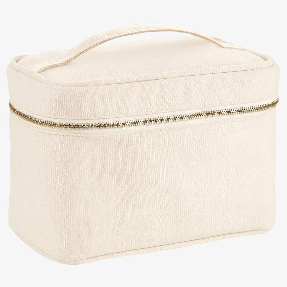 Toalettväskan i borstad bomullscanvas har en bomullsrem för transport, bomullsfoder och dragkedja. Den har en volym på 5 liter och lämpar sig för olika användningsområden. Väskans mått är 23 x 16 x 14 cm.
