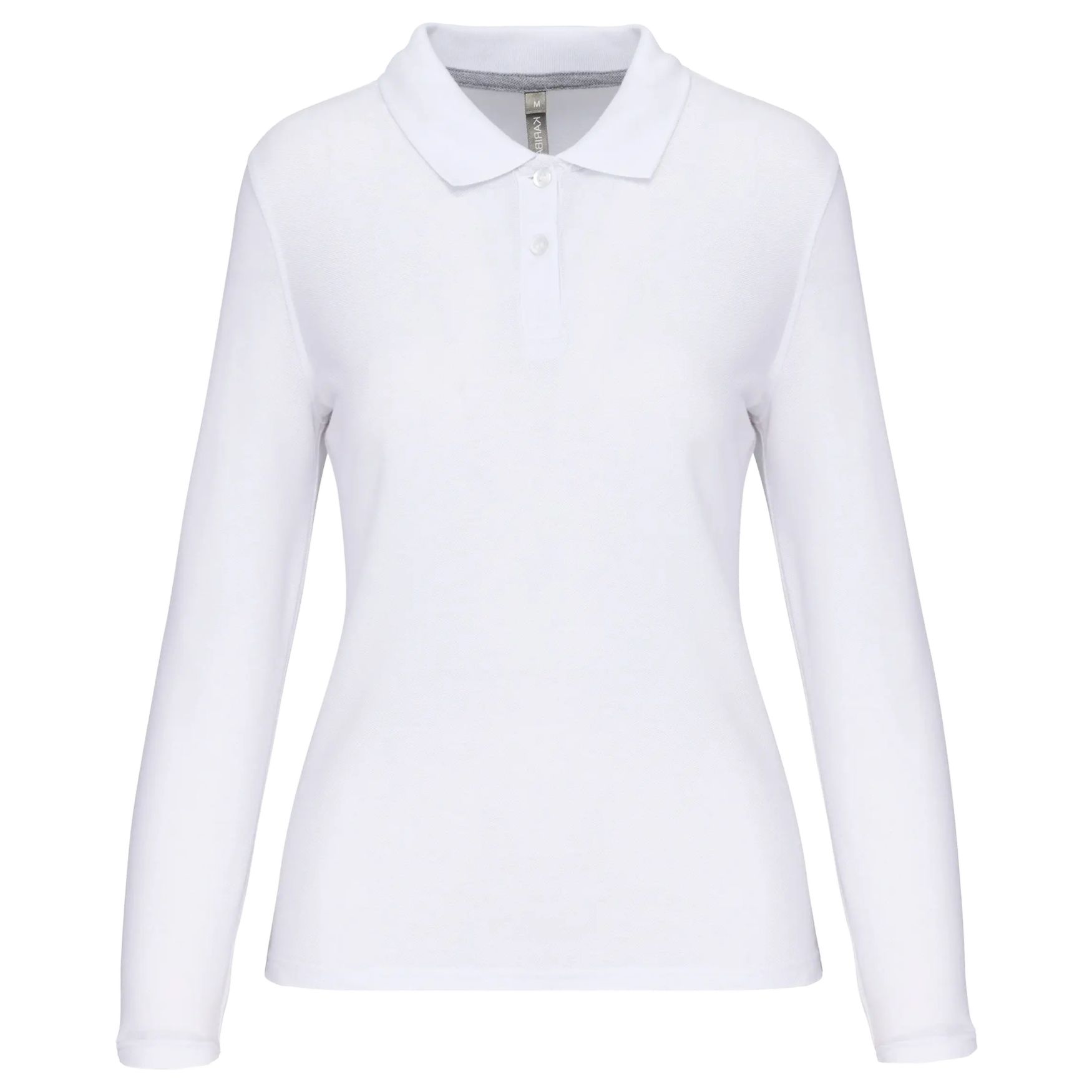 Långärmad polo för dam. Knapphål med två knappar i samma färg. Kanterna är i rippade ärmar med kontrastband. Ärmkanterna är i rippade ändar. Sidfickor med kontrastband för mer komfort. Bottenändarna är i dubbel sydd. Konstruerad för professionell användning. Sammansättning : 65% polyester, 35% kamgarn bomullsstickad