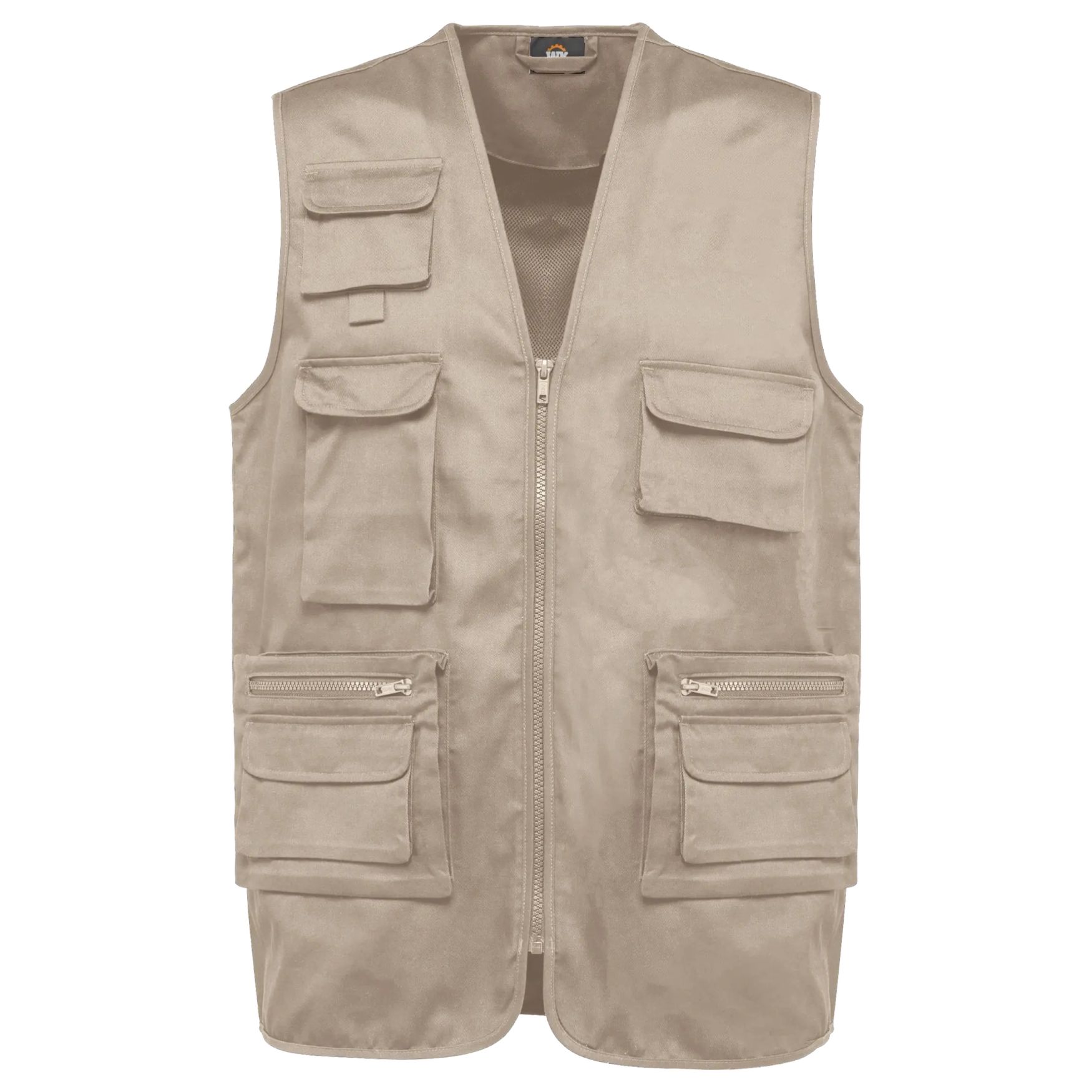 Polyester och bomullsgilet med flera fickor dubbel sidor unisex. Justerad passform med nätmaskin insida på halva baksidan. Detta gillet har två dubbla framfickor med klapp, varav en med plastzipper och en med klappband, samt tre bröstfickor med klapp och klisterremsförslutning. Plastzipper ton i ton och inre hängslinga på krage. Förlängt rygg med kanttonad passform ton i ton vid axelöppning och kanter. Namnbricka inne och märkesbricka Tear Away.