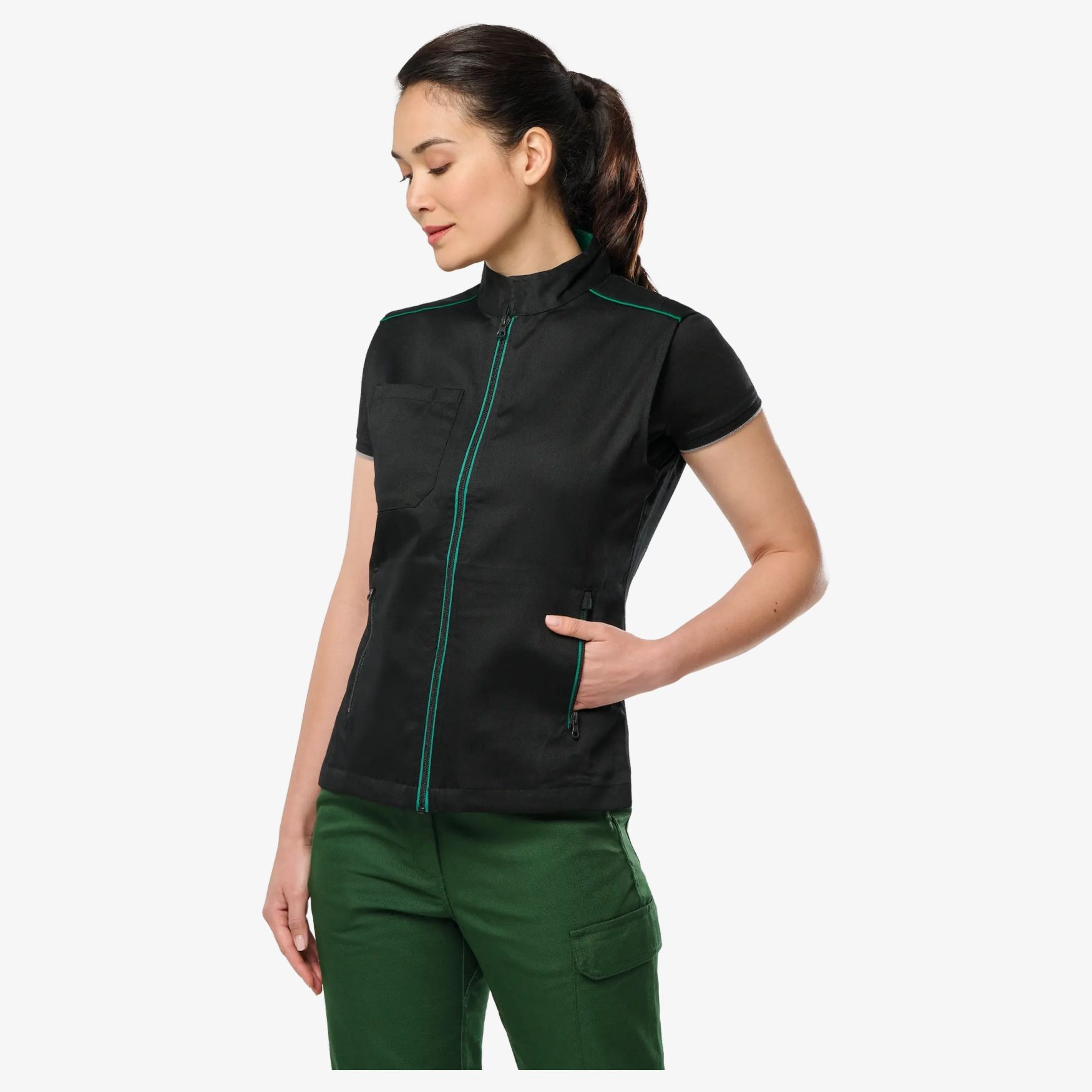 Dagtilldags-väst för damer. Denna väst har två stängda fickor på sidorna, en öppen bröstficka till höger med pennfack och en namnbricka inuti. Den har ett framluck med dragkedja, kontrastfickor och kontrastkantlistning på axlarna. Innanpå kragen finns också kontrasterande insida med fästeband. Två ryggenheter för ökad rörelsefrihet.