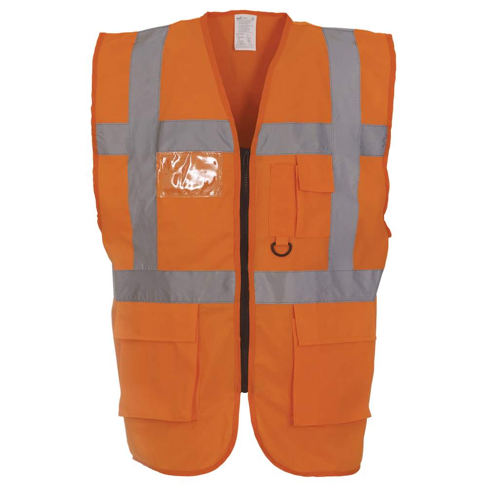 Denna multifunktionella högvisibilitetsskärm erbjuder utmärkt synlighet och funktion. Den är utrustad med reflekterande band som är 5cm breda runt kroppen och på axlarna för ökad säkerhet. Den har en ficka för mobiltelefon eller radiosändare, samt två nedre fickor med klämmor tillgängliga från ovan och sidan, inklusive fickor för pennor och nyckelringar. En ficka för identitetshandlingar finns också på höger sida, och en stor yta bakom gör det möjligt att dekorera.